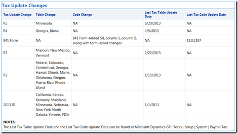 Payroll Tax Update for Microsoft Dynamics GP. This is the first tax update for 2015. It includes state tax table changes that take effect January 1, 2015. You’ll need to install this update before processing your first payroll runs for 2015. ... Retrieve Document